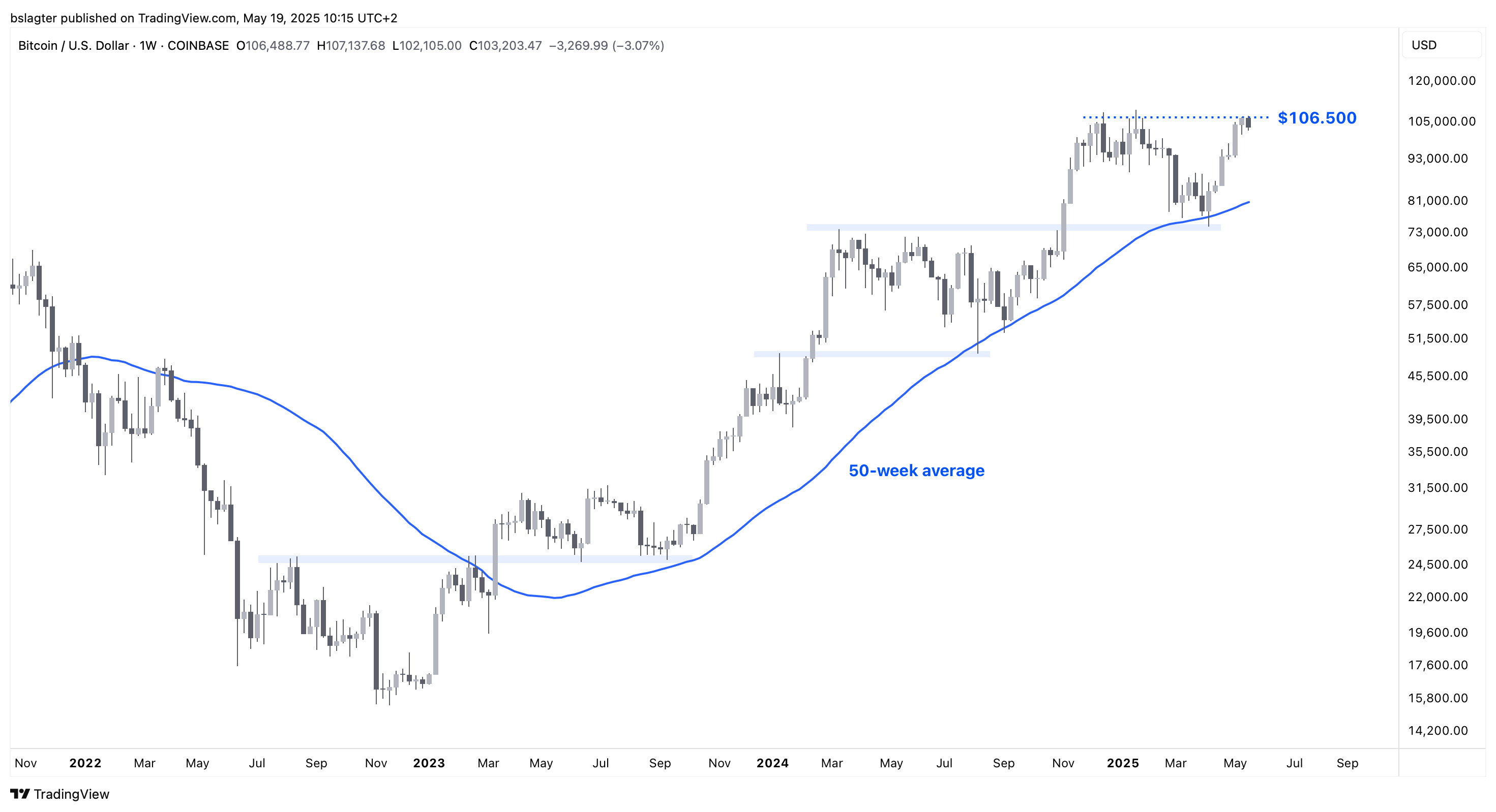 Measured in dollars, we recorded the highest weekly close ever at $106,500. After six weeks of gains, it wouldn't be surprising to see a short-term pullback. However, more and more indicators suggest that the uptrend could continue through the summer.