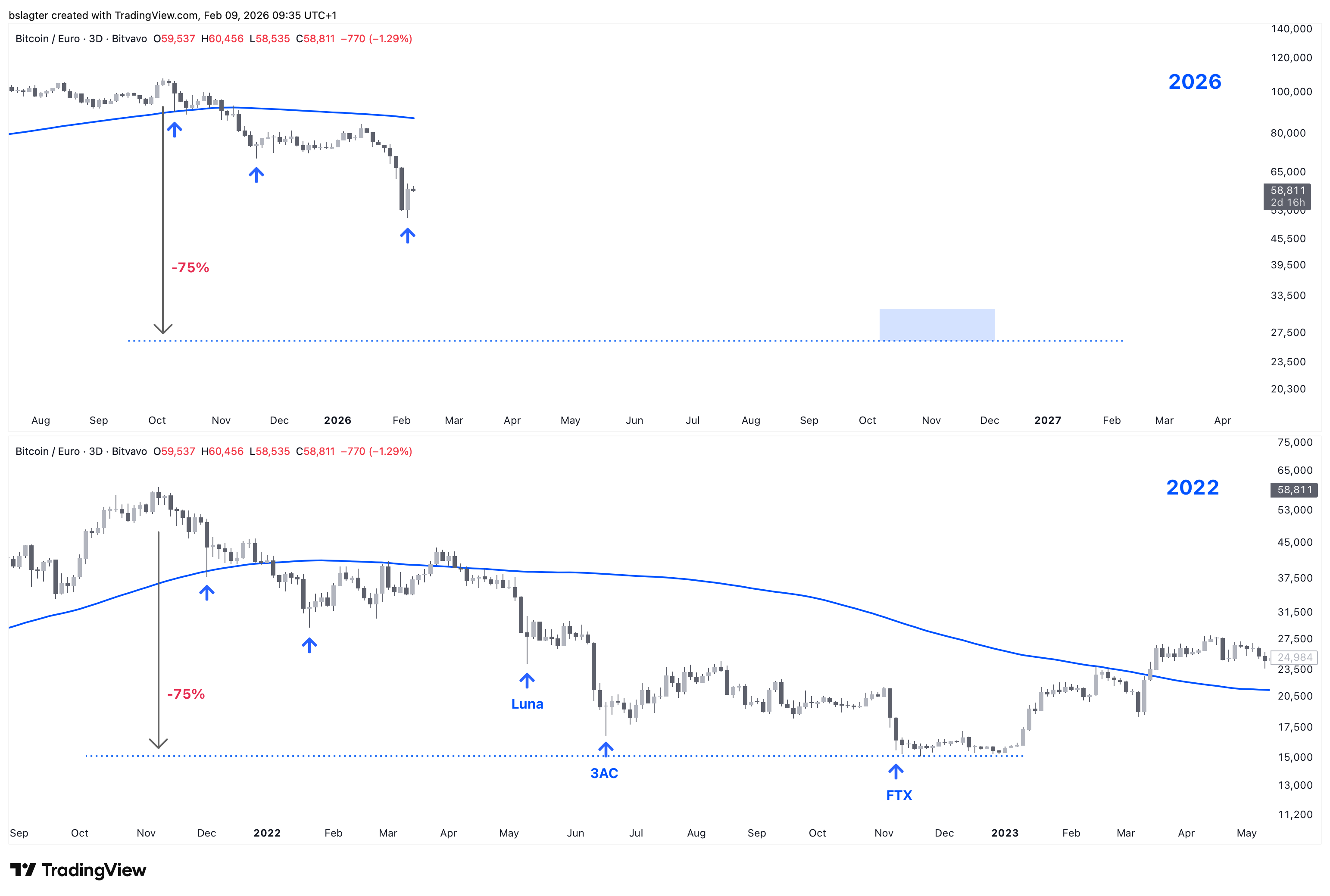 Die Kapitulation war der Höhepunkt eines längeren Abwärtstrends. Zwischen dem 14. Januar und dem 5. Februar fiel der Kurs um 40 % von 84.000 € auf 51.000 €. Der Tiefststand liegt nun 52 % unter dem Höchststand des Bullenmarktes von 107.400 €.