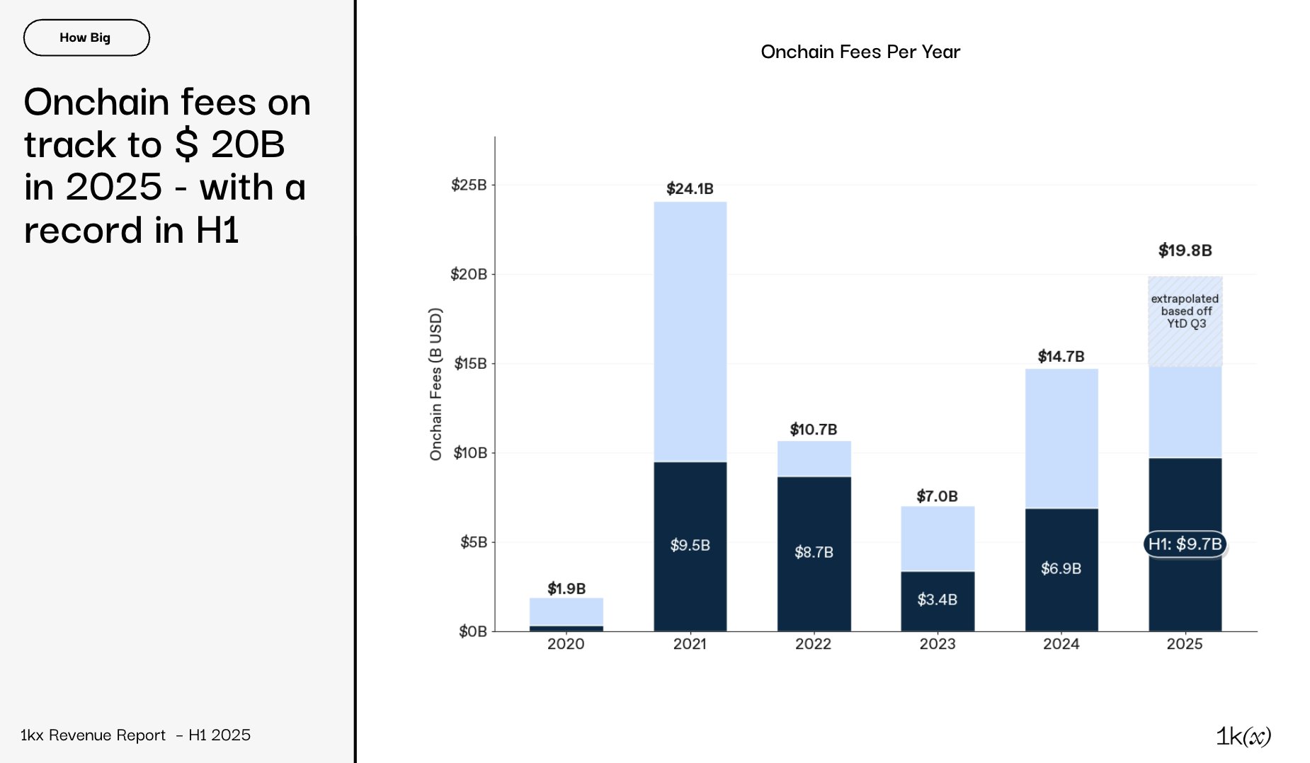 In der ersten Hälfte des Jahres 2025 zahlten Nutzer 9,7 Milliarden $ an On-Chain-Transaktionsgebühren – über 40 % mehr als im Vorjahr. Hochgerechnet auf das gesamte Jahr entspricht das fast 20 Milliarden $, also dem Zehnfachen des Werts von 2020. Und das ist nur der sichtbare Teil. Berücksichtigt man auch die Einnahmen von Stablecoin-Emittenten und -Börsen, schätzt 1kx den Wert der gesamten Kryptowirtschaft auf 56 Milliarden $.