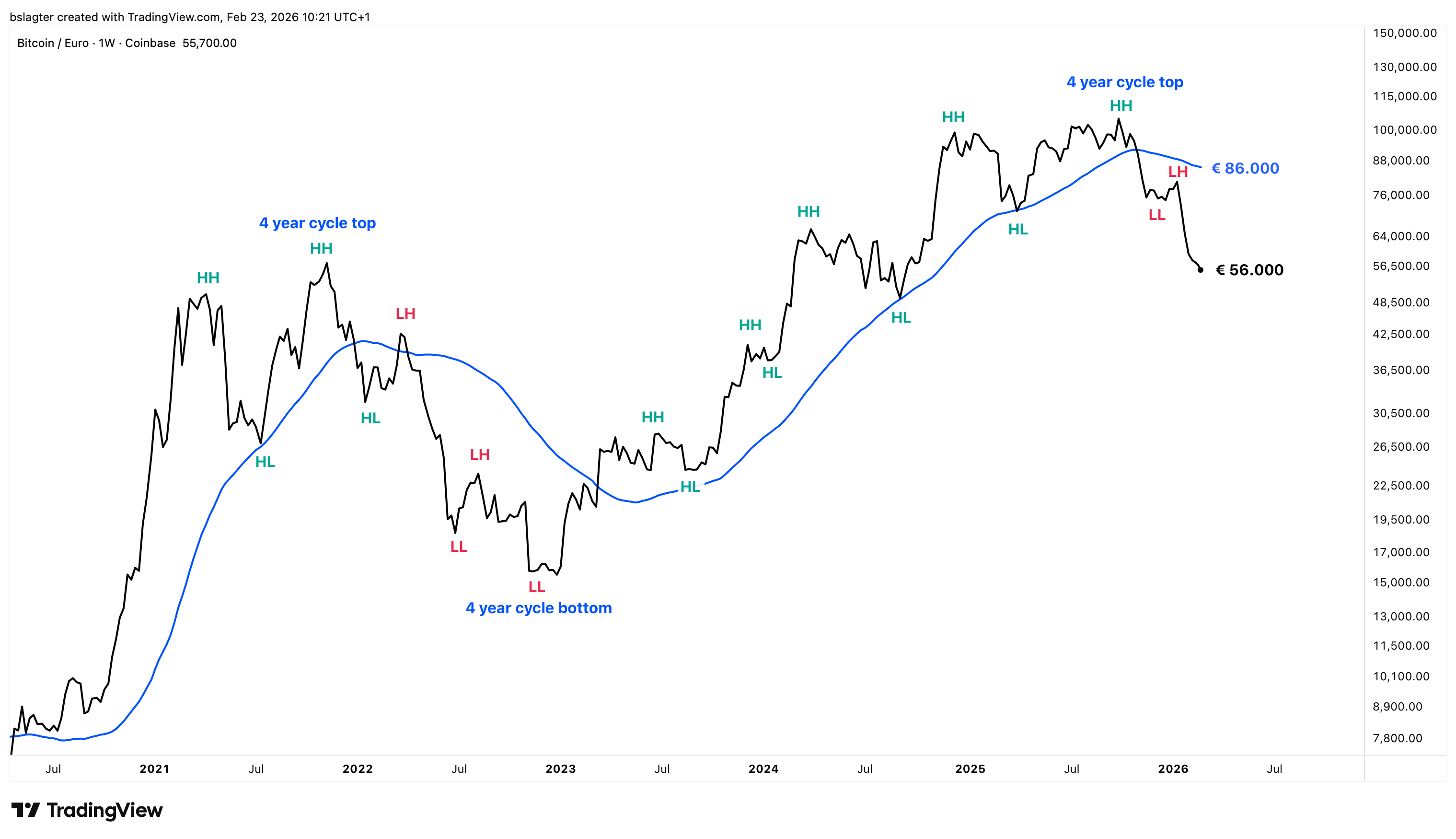 For Bitcoin, we often look at moving averages with a length of roughly one year. On a weekly chart, that corresponds to 50 or 52 weeks. That average currently stands at €86,000, while the price, at €56,000, remains well below it.