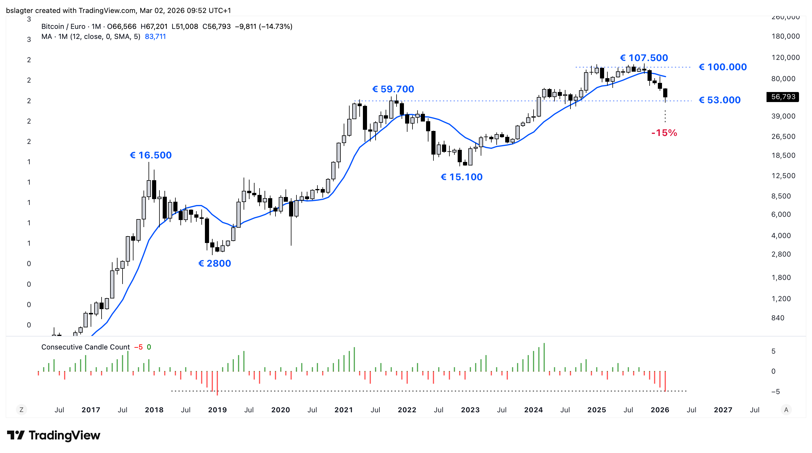 Het begin van een nieuwe maand is een geschikt moment om met wat meer afstand naar de markt te kijken. Februari begon onrustig. In vier dagen tijd daalde bitcoin van € 67.000 naar een dieptepunt van € 51.000 op 6 februari. Daarna stabiliseerde de koers en bewoog de rest van de maand zijwaarts rond € 56.000.