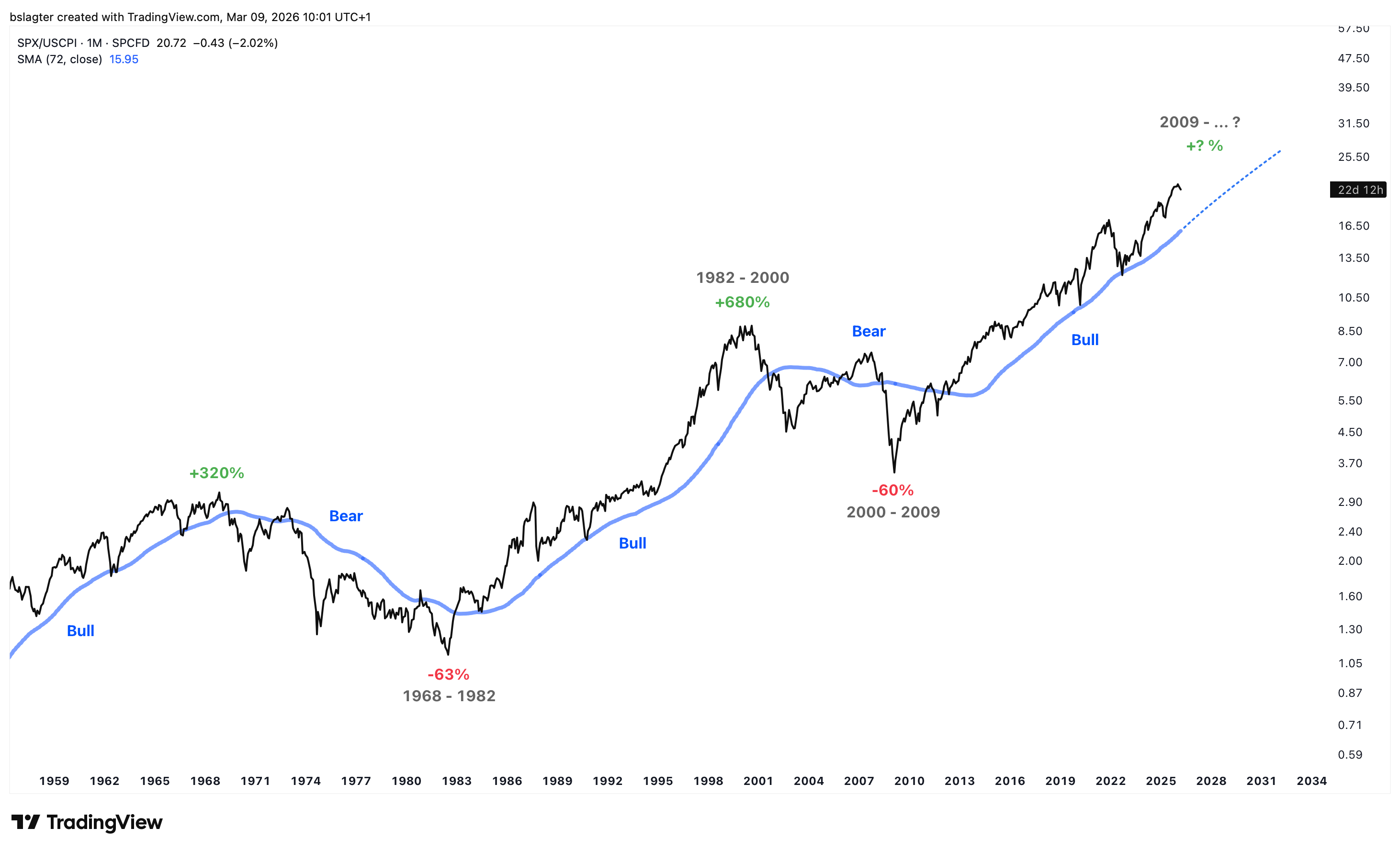 Een nuttige manier om financiële markten te begrijpen is door te kijken naar krachten op drie tijdschalen. Seculaire krachten spelen zich af over decennia. Denk aan de opkomst van nieuwe technologieën die langzaam volwassen worden en breed in gebruik raken. Ook bestaan er seculaire bull- en bearmarkten. De aandelenmarkt zit sinds de bodem in maart 2009 al 17 jaar in een seculaire bullmarkt.