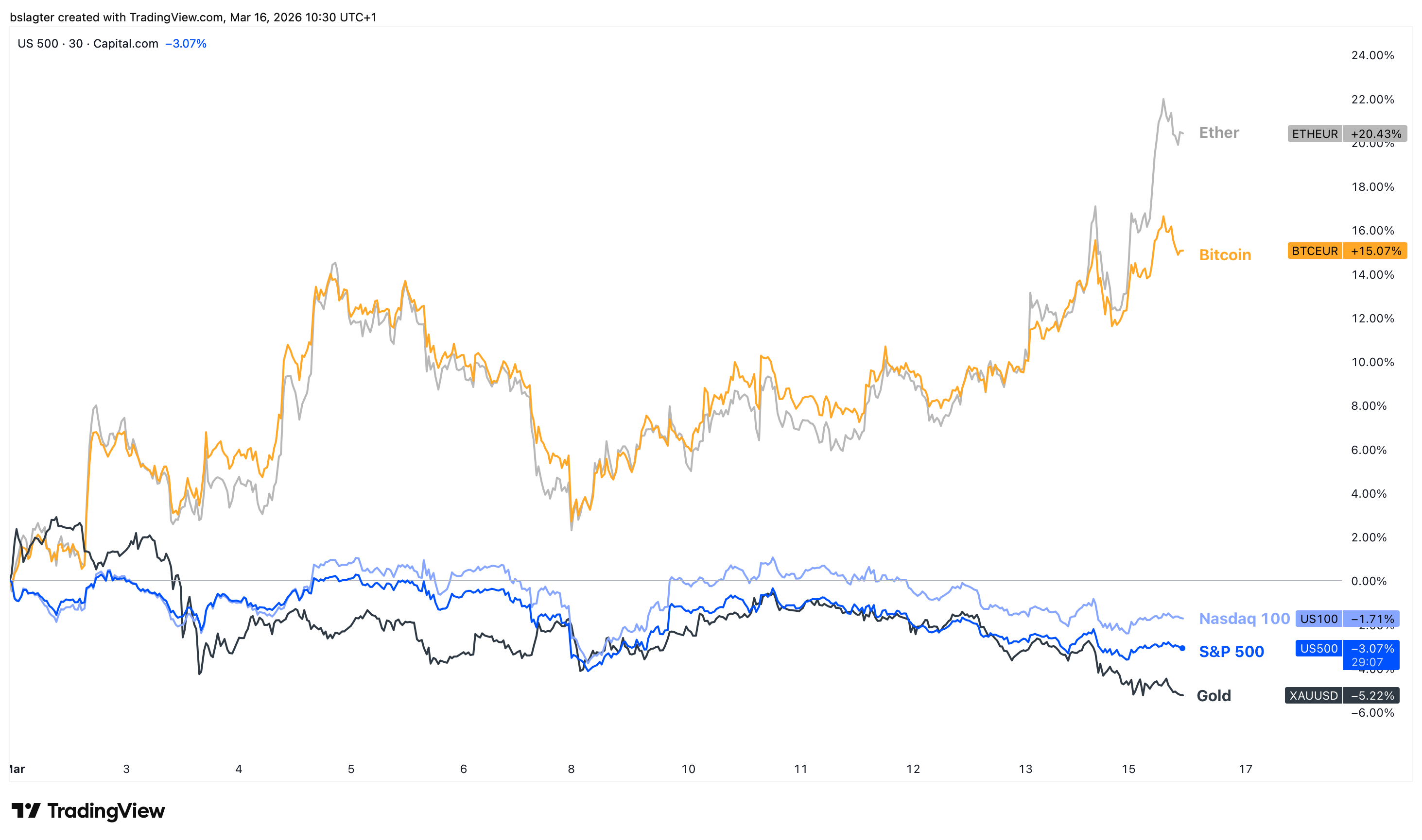 De relatieve kracht van bitcoin en veel andere cryptomunten in de afgelopen twee weken heeft velen verrast. Sinds het begin van de oorlog op 28 februari is de koers van bitcoin met 15% gestegen, terwijl de grote Amerikaanse aandelenindex S&P 500 met 3% daalde, en goud zelfs met 5%.