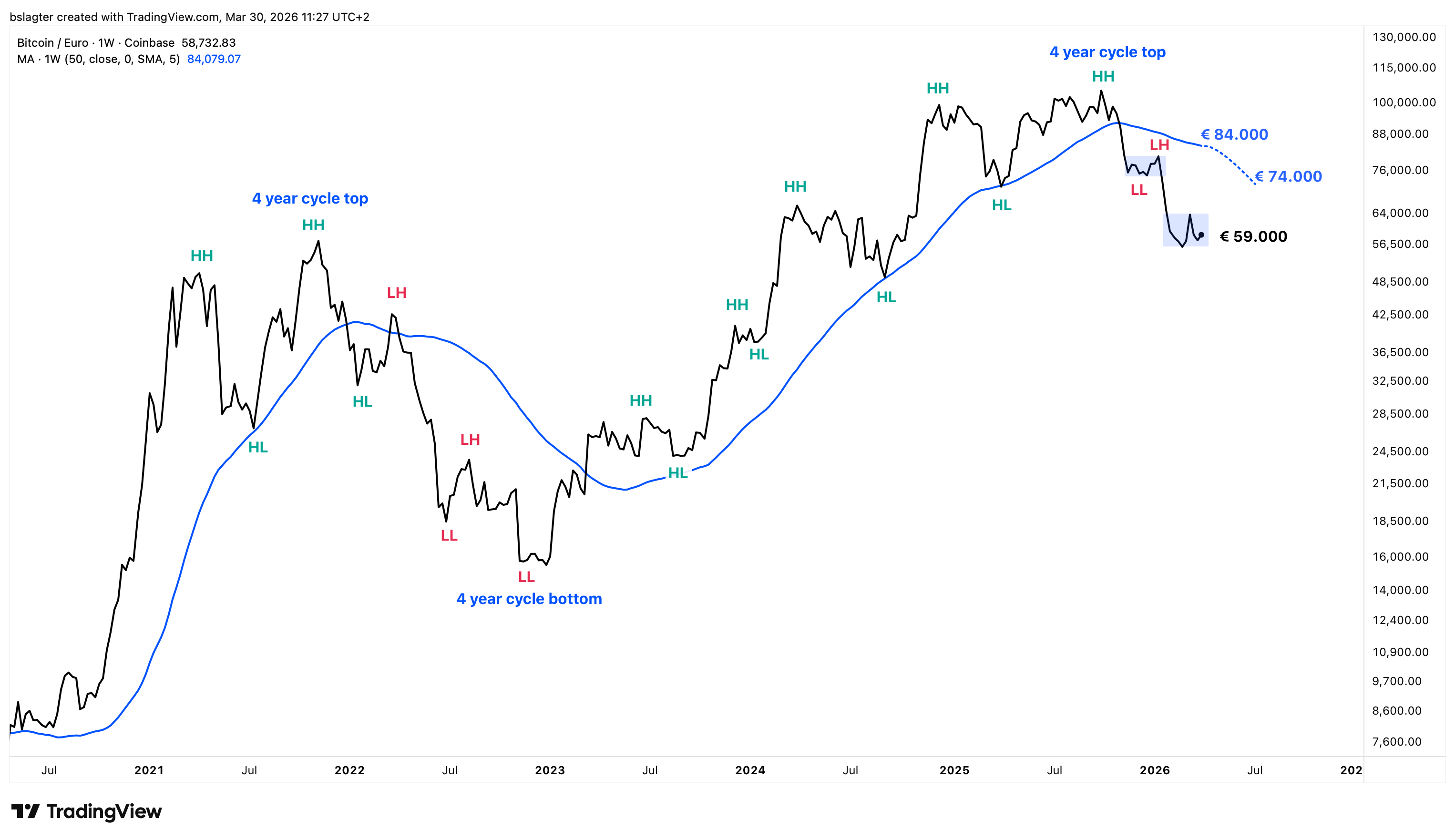 Het is verleidelijk om dat te interpreteren als bewijs voor het begin van een nieuwe bullmarkt. Dat zou erg snel zijn; meestal hebben bearmarkten meer tijd nodig om een bodem te vormen. Een voorzichtige aanpak zou zijn om te wachten op een weekslot boven het 50-weekse gemiddelde, nu op € 84.000.
